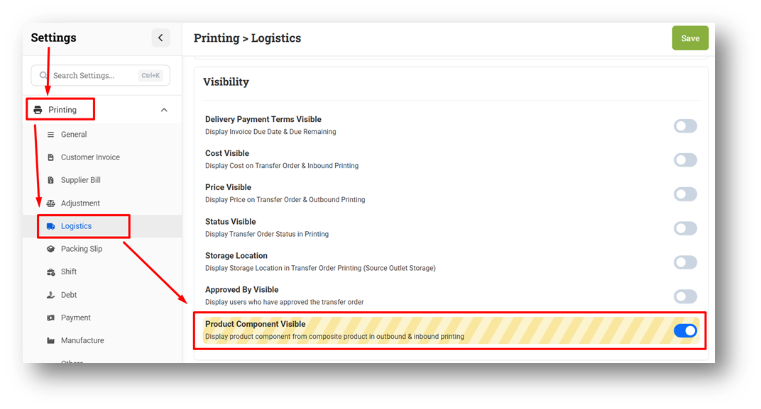 • [Settings - Printing (Logistics)] Product Component Visibility Configuration
