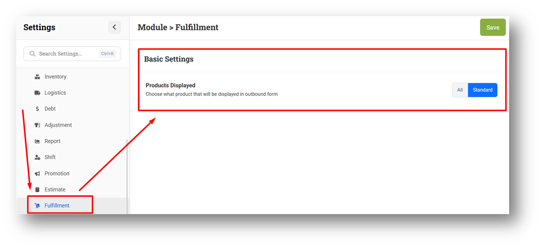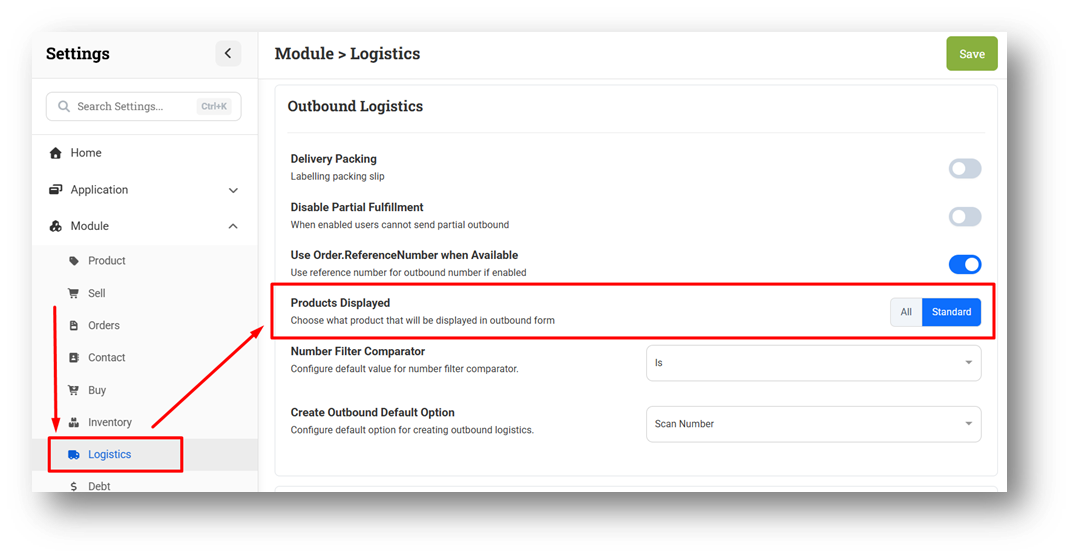 We’ve enhanced consistency across the system by standardizing the former “Send Non-Inventory” setting. In all Logistics modules—both Outbound and Inbound—the setting has been renamed to “Product Displayed.” It now provides two options: All and Standard.