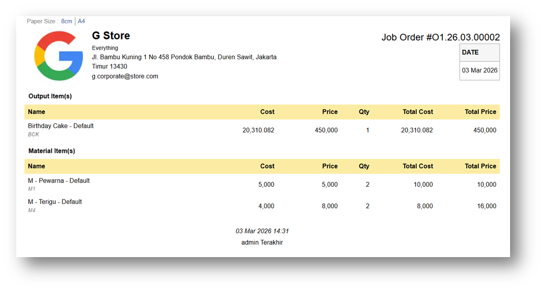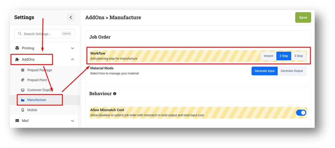 Users can now choose to show or hide specific fields such as Date, Cost, and Price, and these settings apply to both A4 and Mini Printing formats. This ensures consistent formatting across print types while allowing businesses to customize the level of detail included in their manufacture printouts.