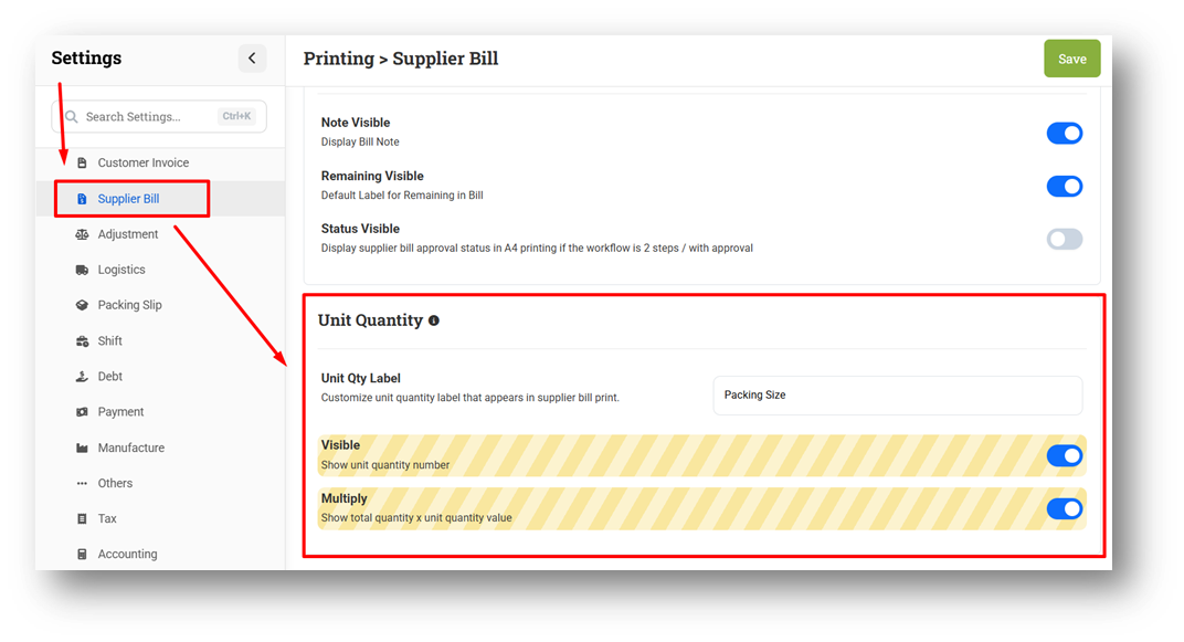 For example, if a product Tissue contains 250 Sheets, the “250 Sheets” information can now be shown on the Supplier Bill printout by enabling this setting. This enhancement ensures clearer quantity representation and maintains consistency between Supplier Bill and Customer Invoice print formats.