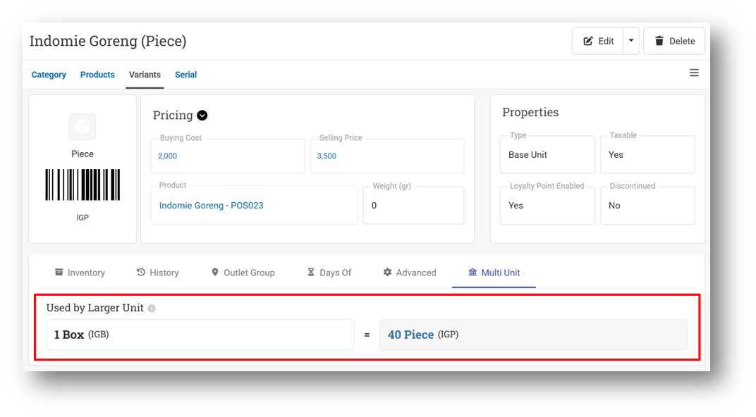 We have also introduced clearer terminology. The smallest unit is now officially called “Base Unit”, while units that reference another unit are called “Multi Unit.” Only one Multi Unit can reference each Base Unit, so the relationship is strictly one-to-one. This change improves data consistency and prevents complex unit hierarchies that could lead to confusion or stock miscalculations.