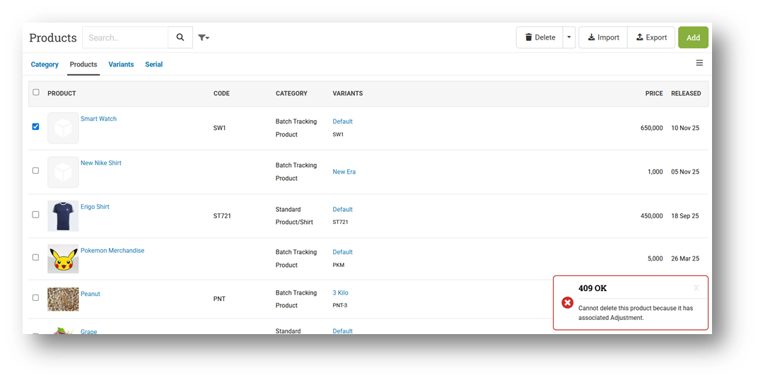 [Products] Improve Toaster Message When Deleting Product With Existing Adjustment Record