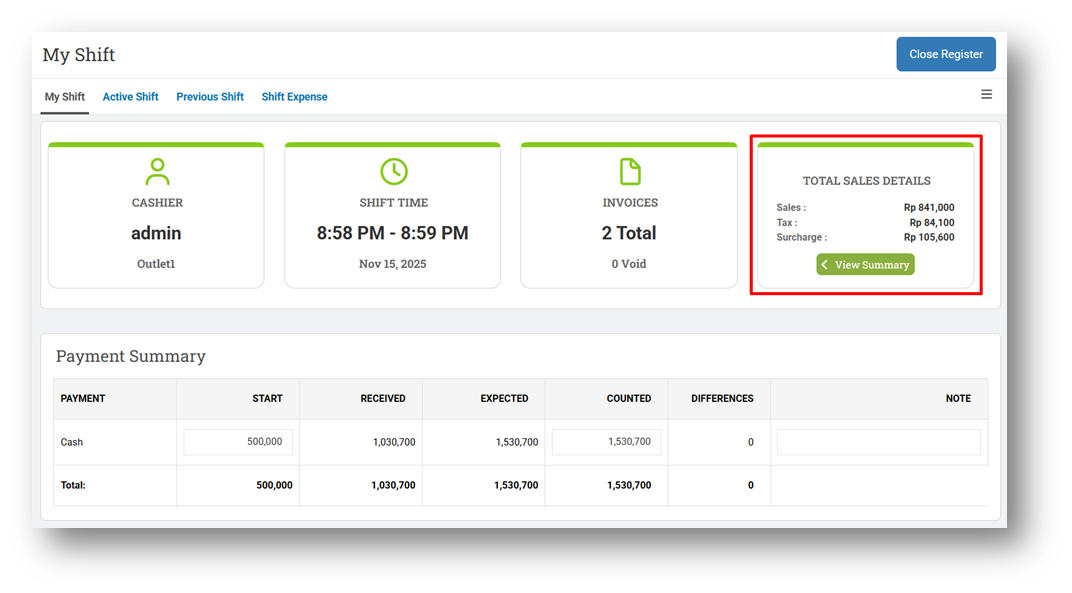 The updated UI now features standardized card sizing, improved labeling, and clearer grouping of information. Additionally, the Total Sales Amount card has been enhanced: while it still displays the combined total of Sales, Tax, and Surcharge, users can now click “View Detail” to see a breakdown showing each component amount individually. This helps users better understand how the total value is calculated and improves transparency when reviewing shift financials.