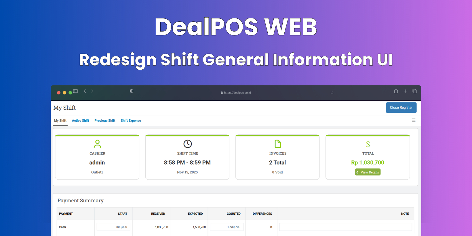 We have redesigned the General Information section on the Shift page to provide a cleaner, more consistent, and more informative layout. Previously, several cards had inconsistent heights and unclear labeling, especially for the Total Sales Amount, which confused users when reviewing shift summaries.