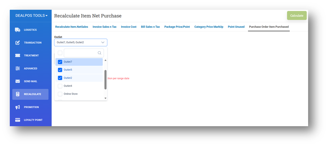 [Recalculate - Item Net Purchase] Allow Users to Recalculate Item Net Purchase from Multiple Outlets