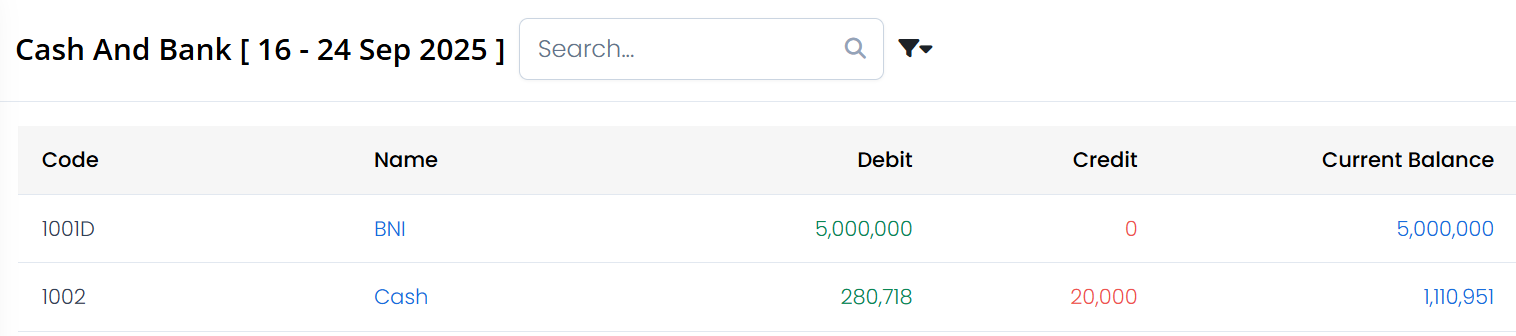 Added Debit and Credit columns to the Cash and Bank menu, allowing users to view debit and credit totals within a selected period.