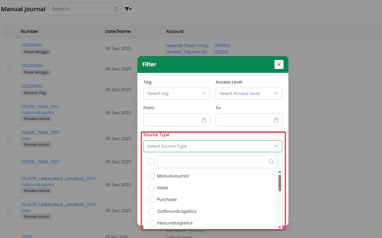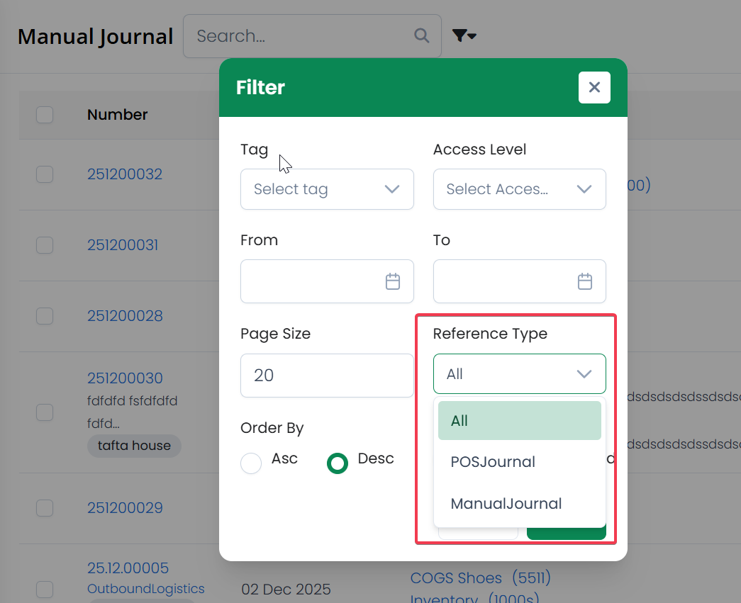 Fixed General Ledger from manual journal appearing even when user does not have access to the related COA tag