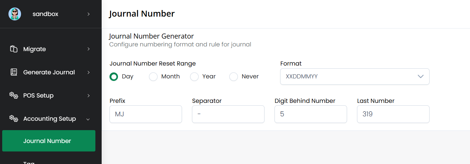 Prefix : Allows you to define a custom prefix at the beginning of the journal number.