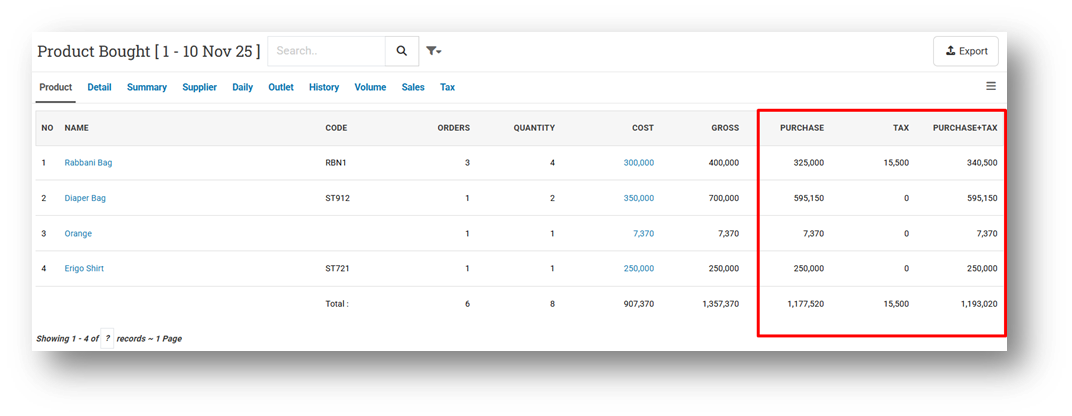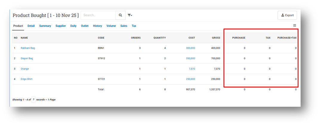 Once the recalculation is complete, reopening the Purchase Report will show that fields previously displaying 0 now contain accurate values. Metrics such as Purchase and Purchase + Tax are fully updated, providing consistent and reliable cost information aligned with the latest computation standard.