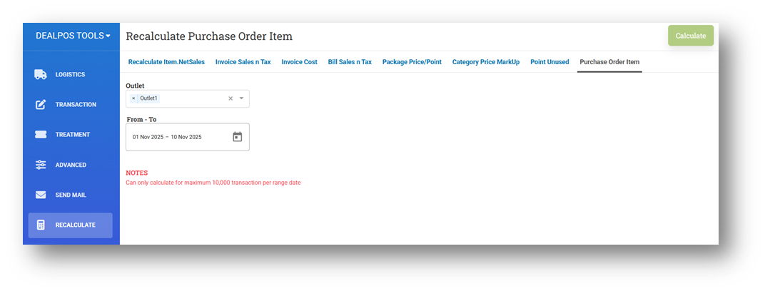 To update these historical entries, users can execute the Recalculate Purchase Order Item function in the Tools App. This operation applies the revised calculation logic—redistributing transaction-level discounts and recalculating item-level costs—ensuring that past records conform to the current model.
