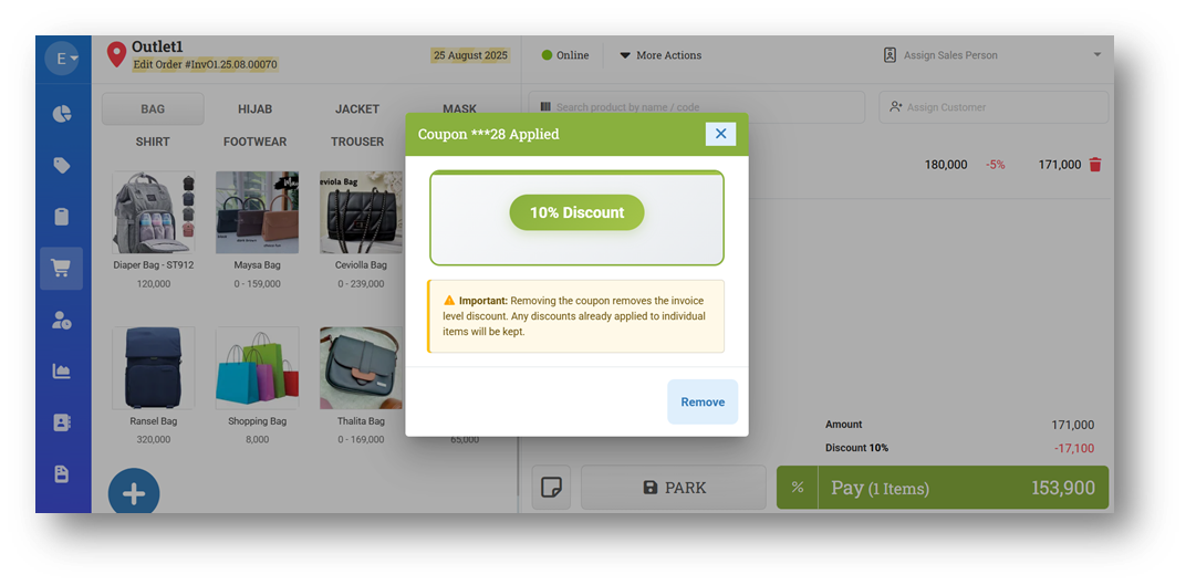When this setting is active, users can remove a coupon directly from the edit form. It’s important to note that removing a coupon will automatically clear any invoice-level discounts applied by the coupon. However, if the coupon discount was applied at the item level, those discounts will remain unchanged and will not be removed.