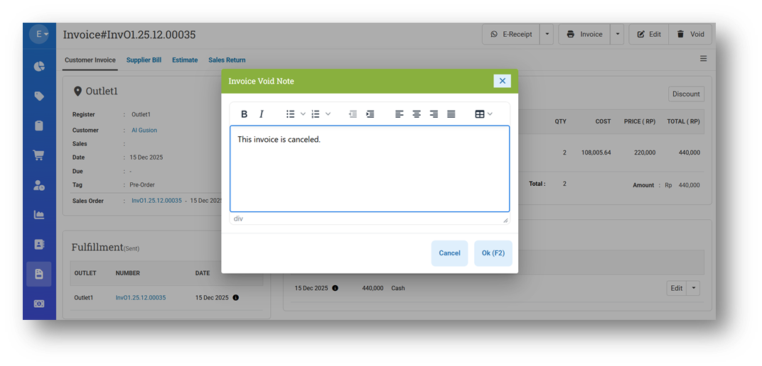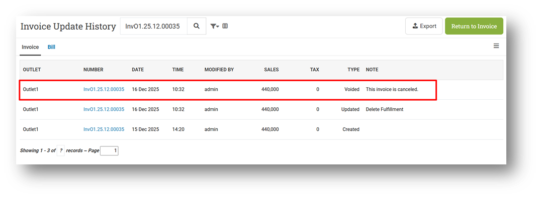 With this update, Void Notes are now stored separately in the Invoice Update History. When an invoice is voided, the system records the action under the update type âVoidedâ and saves the note in the Message/Note field of that history entry. This keeps operational notes and void-related notes clearly separated.
