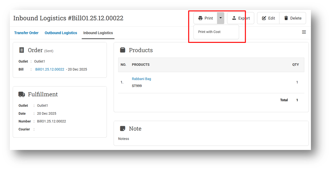 With this update, print options now strictly follow the Logistic Printing settings. For Outbound, if Price Visible is disabled, only the standard Print option will be available, and price information will not appear on the printout. When the setting is enabled, Print with Price becomes available. The same behaviour applies to Inbound printing with Cost, ensuring a consistent and predictable user experience across both modules.