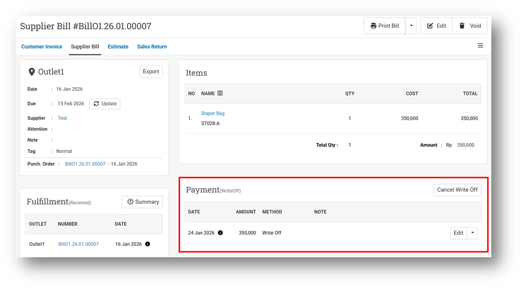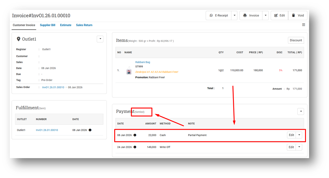 With this update, the behavior is now more precise for new transactions created after this version is released. If an invoice is written off without any payment, the payment status will remain Write Off. If an invoice has received a partial payment and is then written off, the payment status will now be shown as Settled. This helps users clearly differentiate between fully unpaid write-offs and partially paid invoices that have been officially closed. Please note that this change does not apply automatically to existing transactions created before this release. If you want older invoices to reflect the correct Settled or Write Off status, the payment records must be manually updated.