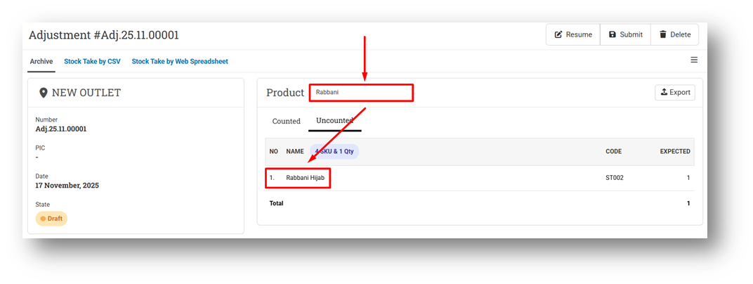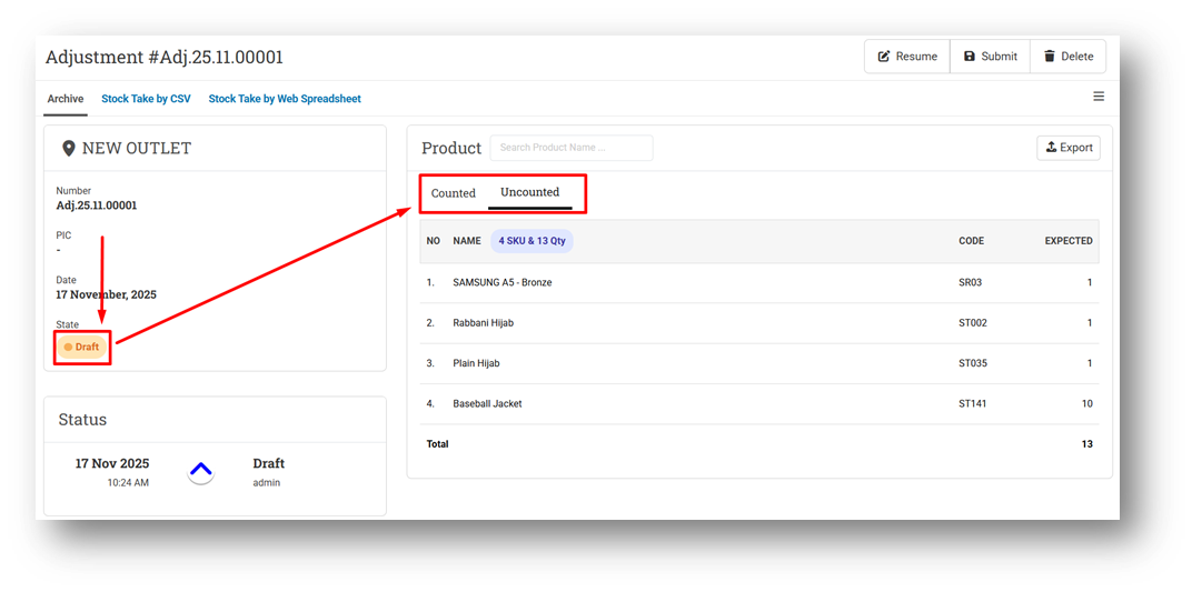 We’ve redesigned the Adjustment Info page for Count-type adjustments when the status is still Draft or Pending to reduce unnecessary steps. Previously, users had to open a separate modal to view uncounted items. Now, Counted and Uncounted item lists are displayed together within a single card, making it easier to review counting progress without leaving the page.