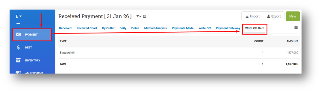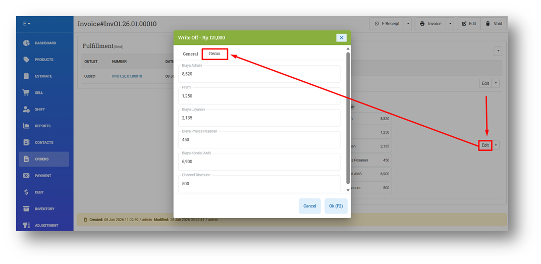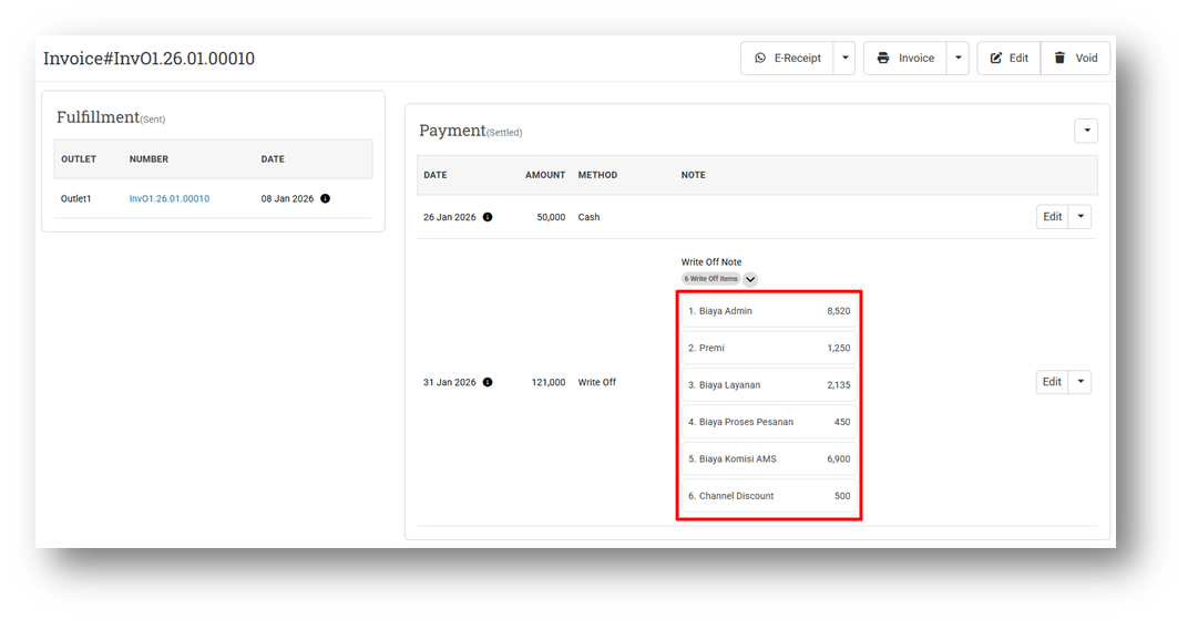 We’ve enhanced the Write Off Invoice Payment feature to better handle invoices synchronized from marketplaces such as Shopee, Tokopedia, TikTok Shop, and others. Previously, write-off amounts (such as admin fees or service charges deducted by the marketplace) were recorded as a single combined value, making it difficult to understand cost breakdowns. With this update, write-off details can now be recorded as separate items. The system provides six default Write Off Item fields, allowing fees such as service fees, premium fees, and other charges to be tracked individually. If additional write-off items are detected during marketplace synchronization, the system will automatically add new items as needed to ensure all deductions are captured accurately.