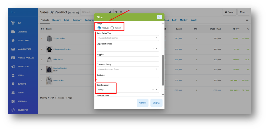 To support analysis and monitoring, the Product Report now includes a Cost Currency filter with two scopes: Products and Variants. When filtering by Products, the system checks the product-level cost currency; when filtering by Variants, it checks the variant-level currency. Similar Cost Currency filters are also available in the Product List and Variant List pages for quicker review.