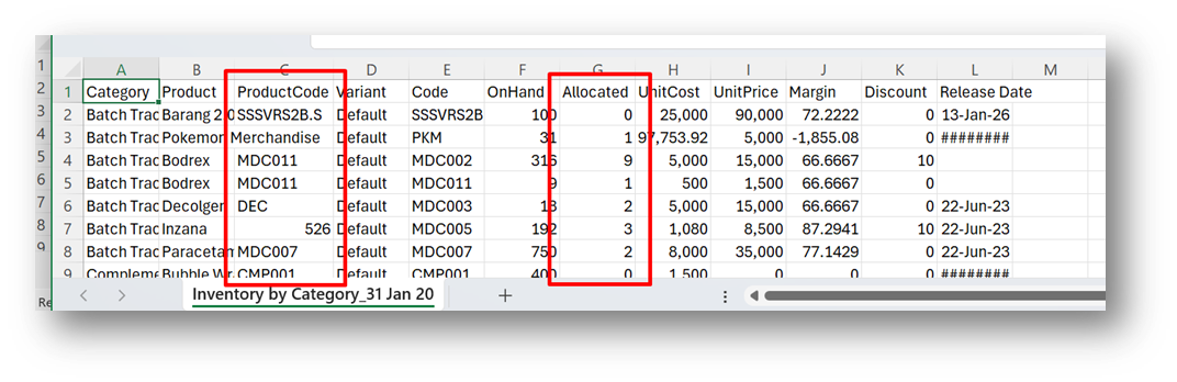 [Inventory - Value] Provide Product Code & Allocated Column in CSV Export (Category Option)