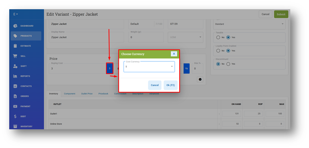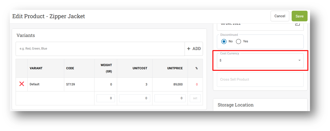 Users can manage cost currency directly from the Product Form and Variant Form, allowing quick updates when supplier pricing changes or when products are sourced from different regions. This ensures each item reflects the correct purchase currency without affecting selling prices or transaction flows.