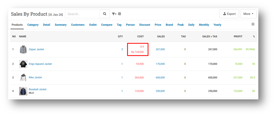To maintain data simplicity, cost values are stored as entered, without dynamic exchange-rate calculations or additional database conversions. In the Product Report, costs entered in a foreign currency are displayed in their original amount and symbol (for example, $9), along with a reference conversion shown below using a fixed exchange rate (for example, Rp 144,000). This exchange rate is static and does not adjust to market fluctuations, and the converted value is shown for reference only.