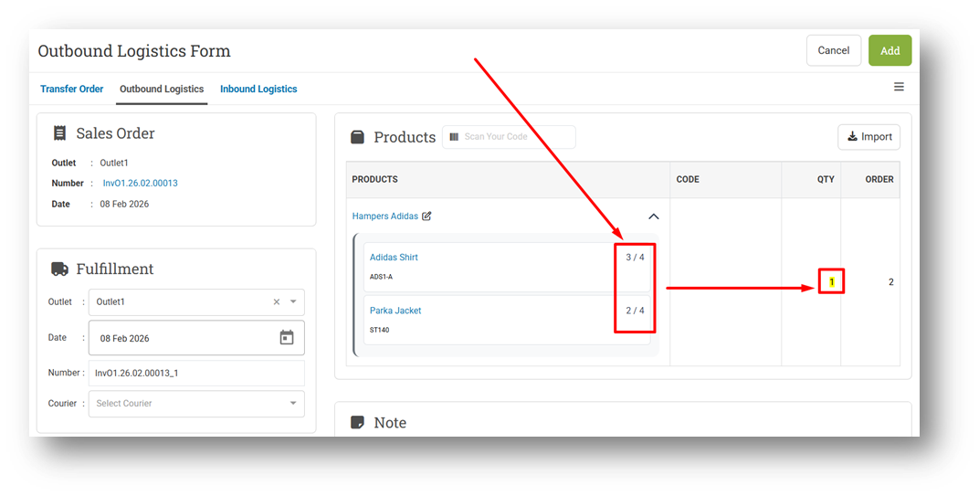 With the new behavior, the indicator now shows the total quantity that needs to be scanned across all bundles (for example, 0/4 Adidas Shirts and 0/4 Parka Jackets when selling two Hampers Adidas). As components are scanned, the progress increases cumulatively. Each time the required quantity for a full bundle is reached (for example, reaching 2/4 for both components), the parent product quantity automatically increments by one. This allows users to scan all Adidas Shirts first and then continue with Parka Jackets, making the workflow more flexible and warehouse-friendly.
