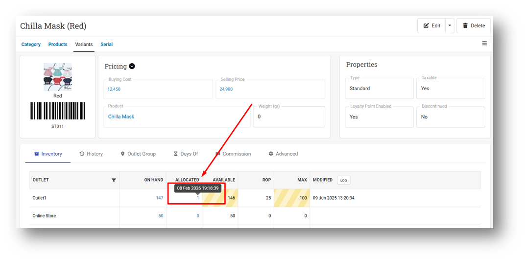 With this update, every allocation event is now recorded in the system. To keep the information simple and easy to read, only the latest allocation timestamp is shown (not the full allocation history). This information is available on the Variant Info page, displayed as a tooltip for Allocated stock per outlet, allowing users to quickly see when the last allocation occurred.