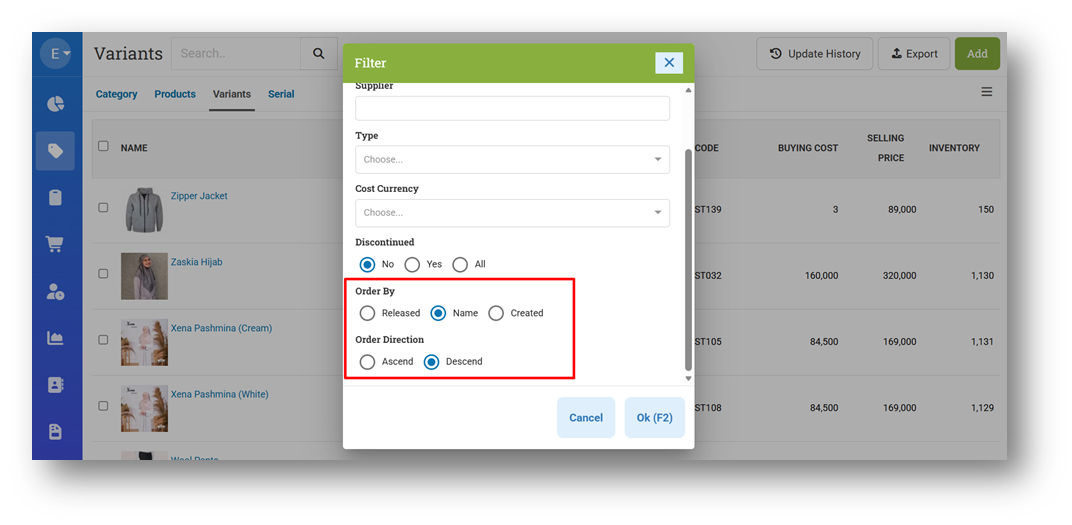 Provide Order By & Order Direction Option on Variant List Filter