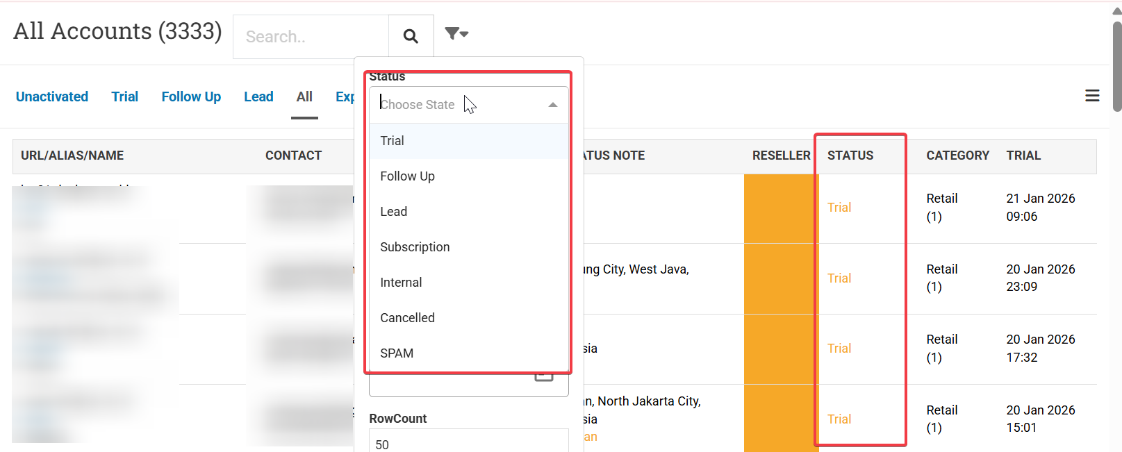 Menu Trial All - Show Colomn Status Account and Filter (Trial / Subscription)
