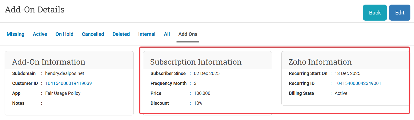 Show Subcription Info and Zoho Information in Add Ons