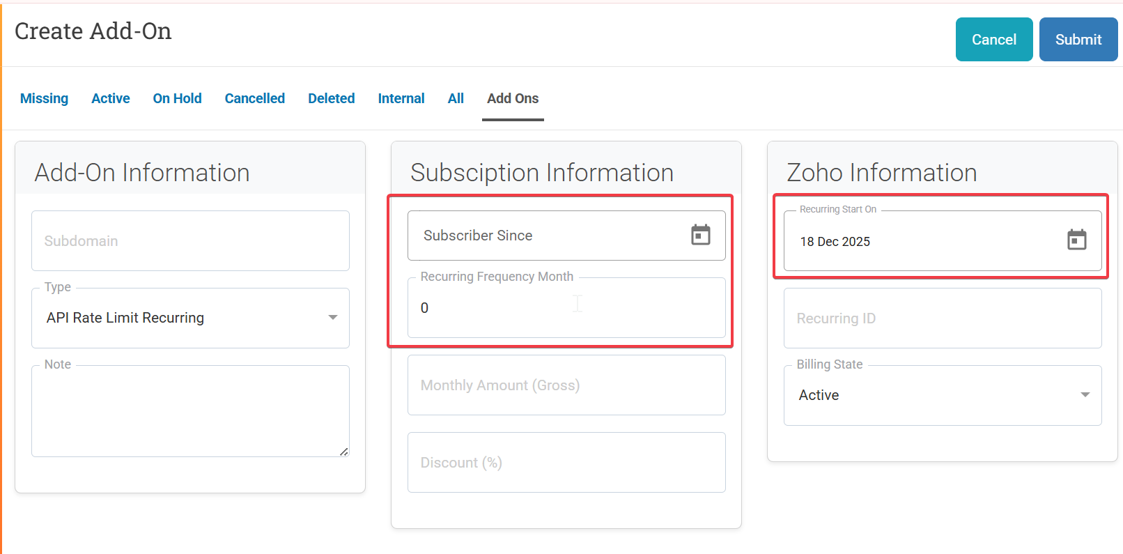 Set Subscriber Since + Frequency + Recurring Start On when add new AddOns